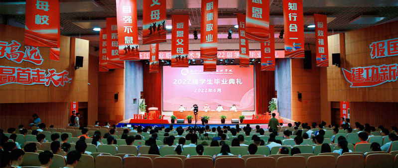 6月25日下午,學校在圖書館報告廳隆重舉行2022屆學生畢業典禮。學校領導、相關職能處室負責人、二級學院班子成員、學工辦主管、教科辦主管、輔導員、班主任代表,2022屆畢業生代表等400多人出席畢業典禮。學校黨委委員、副校長潘榮江主持畢業典禮。